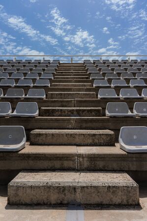 Empty grey stands at the stadium with blue sky