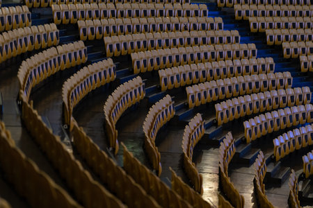 Empty spectator stands in a sports stadium are waiting for enthusiastic fans and spectators