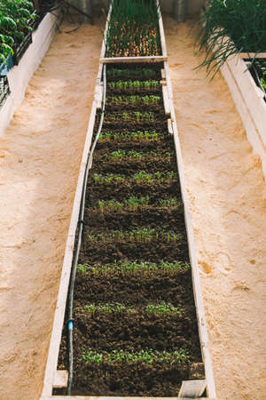 Green oak vegetable plots use a drip system along a hose. It is an applied and integrated vegetable growing in agricultural greenhouses.