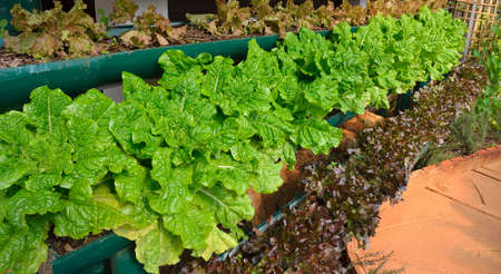 Many kinds of salad vegetable as red coral, cos, green coral etc in farm land and cultivating
