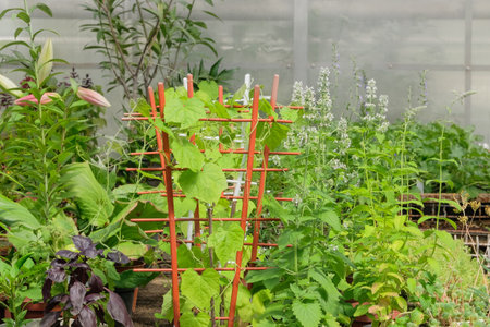Flower seedlings in greenhouse. Mint, basil, lilies and other plants in garden store. Variety of plants for decoration. Hothouse.