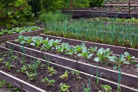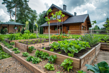 Wooden raised beds with growing plants and vegetables in modern countryside garden near wooden house