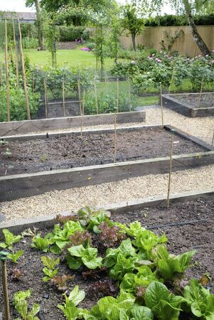 Vegetable growing in raised beds in a garden in an English home, UK