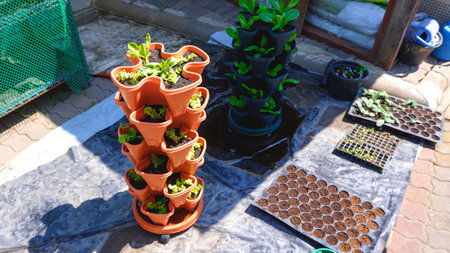 Row of lettuce vegetable in stacked pots, concept of Condo-style plantation idea to increase production in a small space with innovation that breaks down space limitations