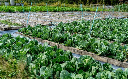 Generic small vegetable garden in Taiwan. Cabbage, cauliflower and beans field.