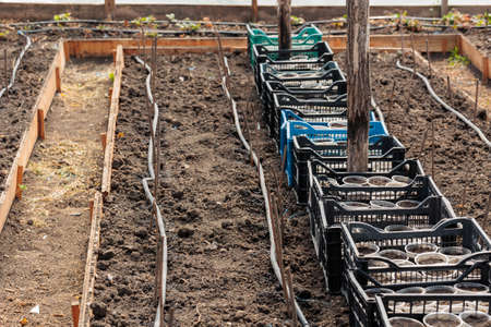 Separate boxes with agricultural crops. View from a drone. Growing plants