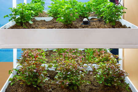 Organic hydroponic vegetable grow with LED Light Indoor garden and bokeh light