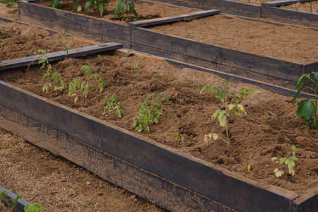 Young tomato seedlings planted in a garden bed inside a greenhouse in a village with selective focus. Home gardening and agriculture. farming as a small business
