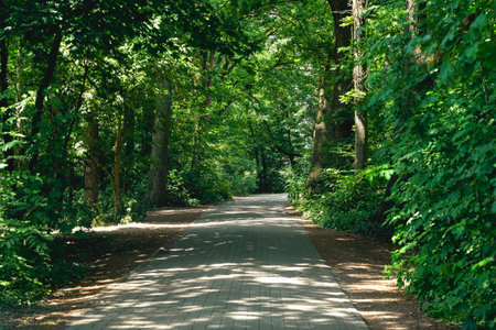 alley in the park among the greenery path paved with tiles among the green trees in the park close-up