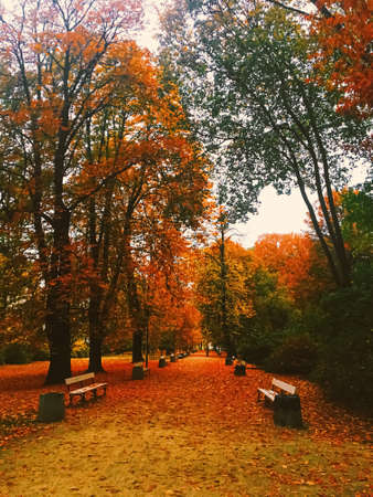 Autumn alley in the park with fallen leaves. Beautiful autumn landscape.