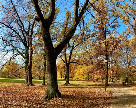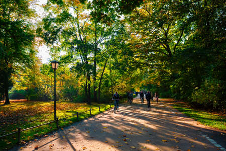 Golden autumn fall October in famous Munich public park - Englishgarten. Munchen, Bavaria, Germany