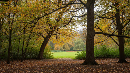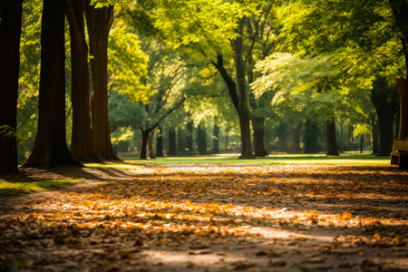 Soft sunlight filters through the lush canopy of a tranquil park, casting a warm glow on the forest floor.