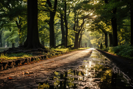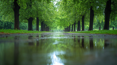 A vibrant park path lined with lush green trees, reflecting puddles on the wet ground after a refreshing rain, creating a serene and calming outdoor atmosphere.