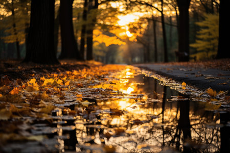 Autumn rain soaking yellow leaves., generative AI