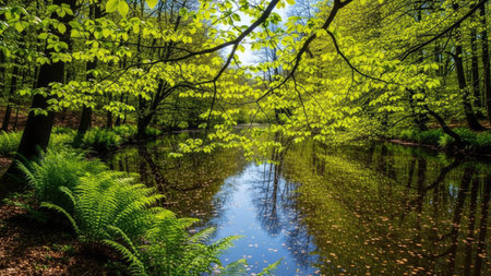 A vibrant image presents a serene forest landscape featuring a calm river winding through. Lush green leaves and ferns dominate, accented by warm sunlight. The composition highlights reflections on the water's surface. Suitable for a variety of editorial or commercial purposes related to nature and environment concepts.