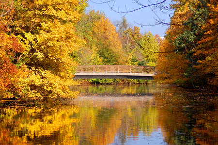 Golden autumn and bridge over the lake in the publuc park