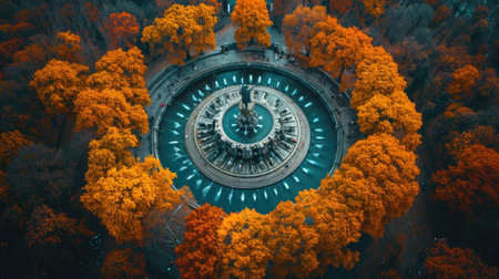 Discover a serene pathway adorned with vibrant autumn leaves and statues, set in a tranquil park. This scenic landscape captures the beauty of nature during fall, offering a peaceful escape.