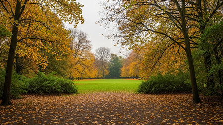 Beautiful autumn landscape in the park with fallen leaves and green grass