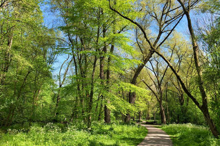 Beautiful green forest on a sunny day. Park, walks