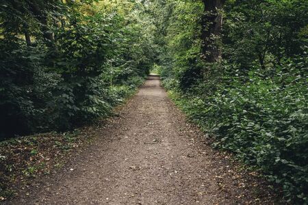 A path in the green forest with trees in the background. Shot in Denmark.