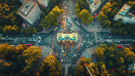 Aerial top down view of Berlin Victory Column roundabout traffic