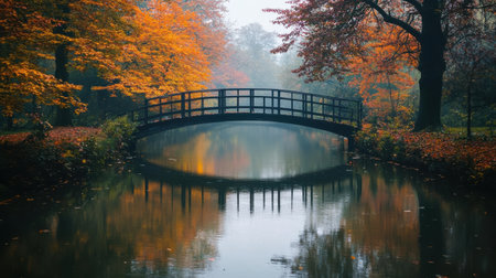 A narrow bridge spans a calm waterway, reflecting vibrant autumn colors from surrounding trees. The misty atmosphere adds a tranquil charm to the picturesque scene.