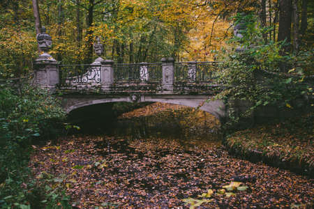 Picturesque and charming garden park in autumn colors, bridge over water, Royal Baths Park, Lazienki Warszawskie, Warsaw, Poland