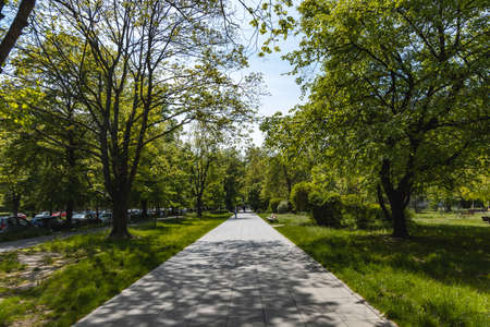 Wroclaw, Poland - May 8 2020: Long path next to long street with trees bushes and benches around