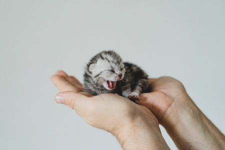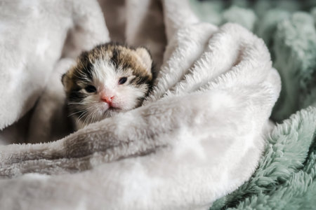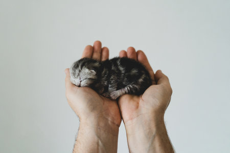 Adorable tiny kitten sleeping peacefully in hands of a person at home