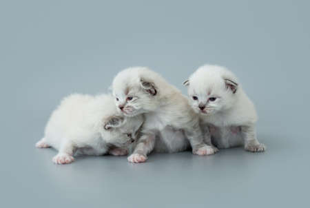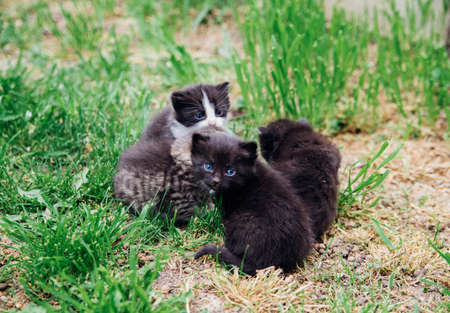 A group of kittens on a green lawn. Little fluffy kittens are walking in the yard. A pet. Taking care of pets. Different color of cats' fur.
