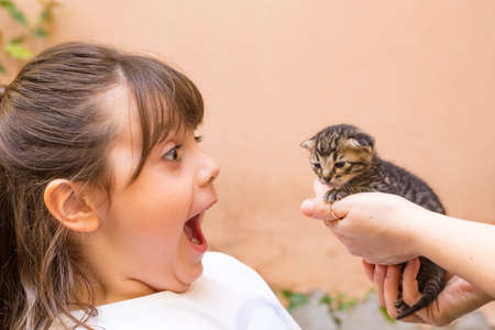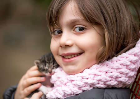 Close-up portrait of a beautiful little girl with a cat in her arms