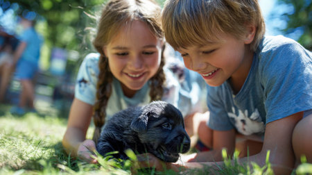 Smiling children playing with a cute puppy on a sunny day, symbolizing joy, innocence, and friendship with animals.