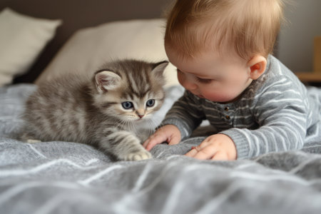 Gentle moment of a baby exploring a kitten, symbolizing innocence, curiosity, and a first experience with pets.