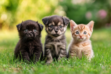 This delightful image captures three adorable young animals, featuring a kitten and two puppies, sitting together on vibrant green grass, showcasing their playful innocence and charming expressions.