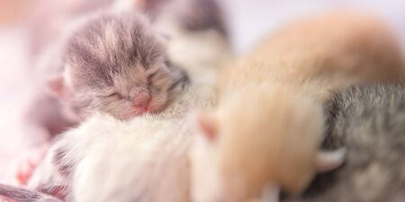 Cute newborn kittens sleep in hugs, closeup face portrait with copy space
