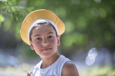 portrait of a child, a dark-haired boy of 10 years old in a summer cafe. Drinks a mojito and eats a hamburger