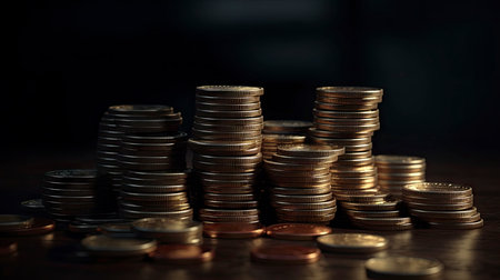A stacked coins illuminated by dramatic lighting create striking visual effect, showcasing texture and shine of metal. this close up captures essence of wealth and finance