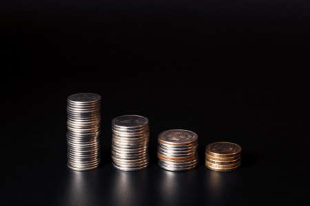 Shrinking stacks of coins on a black background