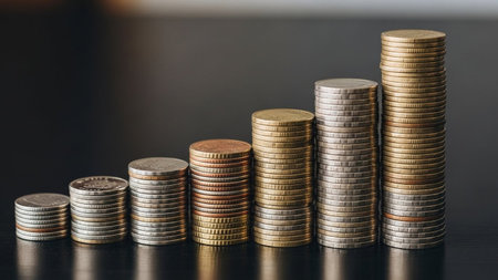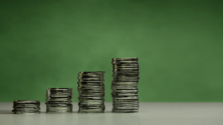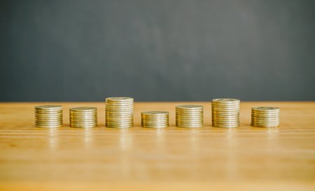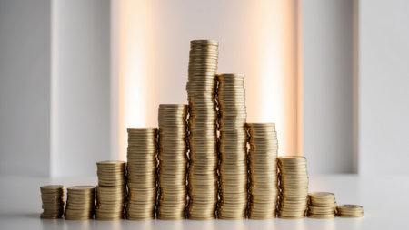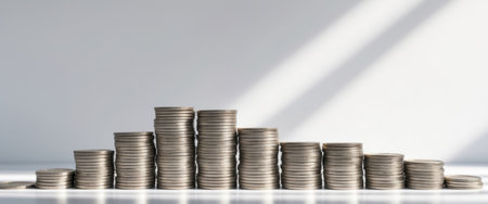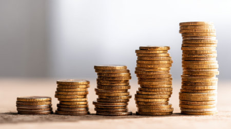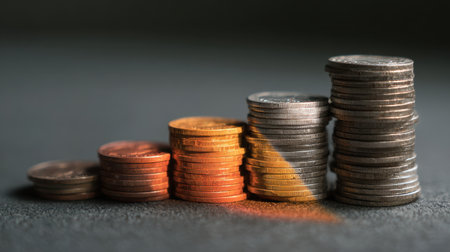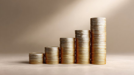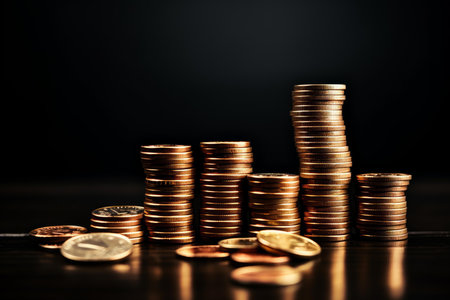 Stacks of coins arranged in ascending order symbolize financial growth and investment. shiny gold coins reflect light, creating sense of prosperity and wealth