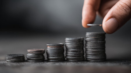 Stacked coins are arranged in ascending order, showcasing hand placing coin on tallest stack. This symbolizes financial growth and investment strategies, evoking sense of progress and prosperity