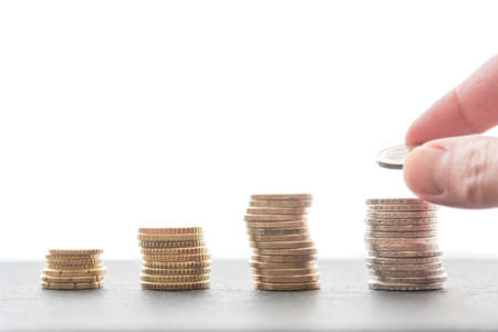 hand piling up stacks of euro coins on light grey stone surface with bright background