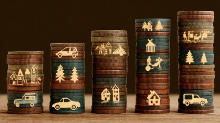 The image showcases five columns of stacked coins, each increasing in height. The coins are brown and copper, with various small icons etched on them, including houses, trees, cars, and tents. The composition is well-lit, suggesting a warm and inviting atmosphere, potentially suitable for financial or economic themes.