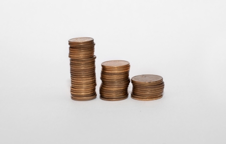 Stack of coins on white background; business, finance, and investment concept
