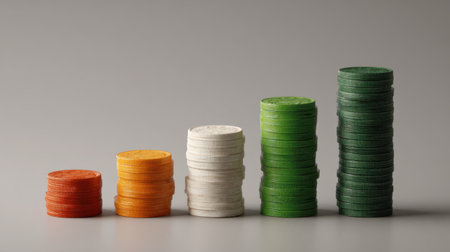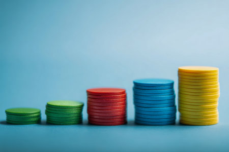 A visually compelling arrangement of colorful coins stacked in ascending order symbolizes financial growth, success, and investment opportunities in a minimalist design.