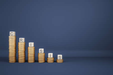 Decreasing coin stacks with letter blocks on blue backdrop with mock up place. Crisis, finance and money concept. 3D Rendering