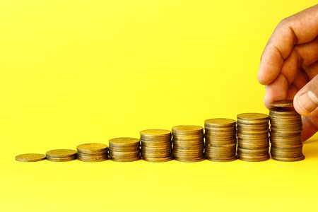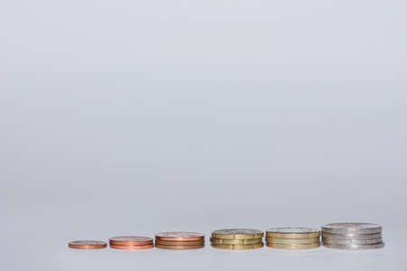 Coins stacking on gray background in saving money concept.