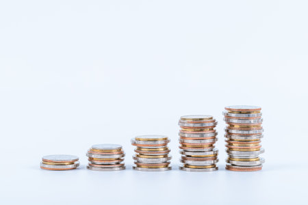Closeup of stacked coins forming a bar graph with a white background Clean, professional image ideal for illustrating financial growth and savings in advertising.