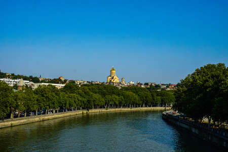 Tbilisi Mtkvari Broad River with Trees and Sameba Cathedral Background View