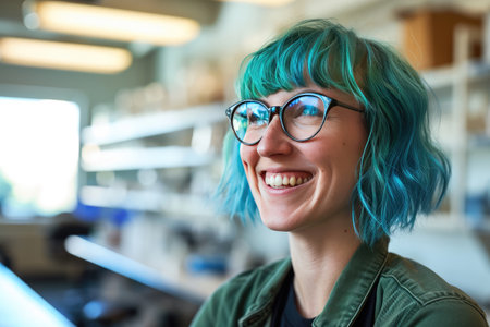 Smiling Woman Employee Neuroscientist With Blue Hair
