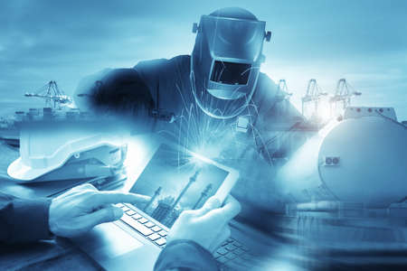 worker with protective mask welding metal and sparks in port for logistic and transport industry